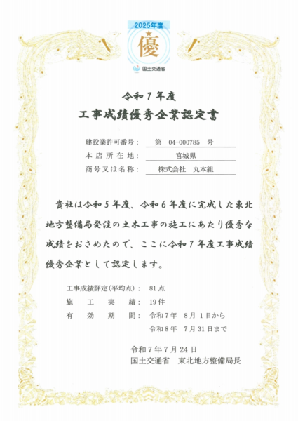 令和7年7月24日、国土交通省東北地方整備局長様より令和7年度工事成績優秀企業認定書が授与されました。
